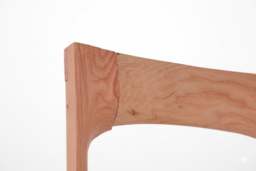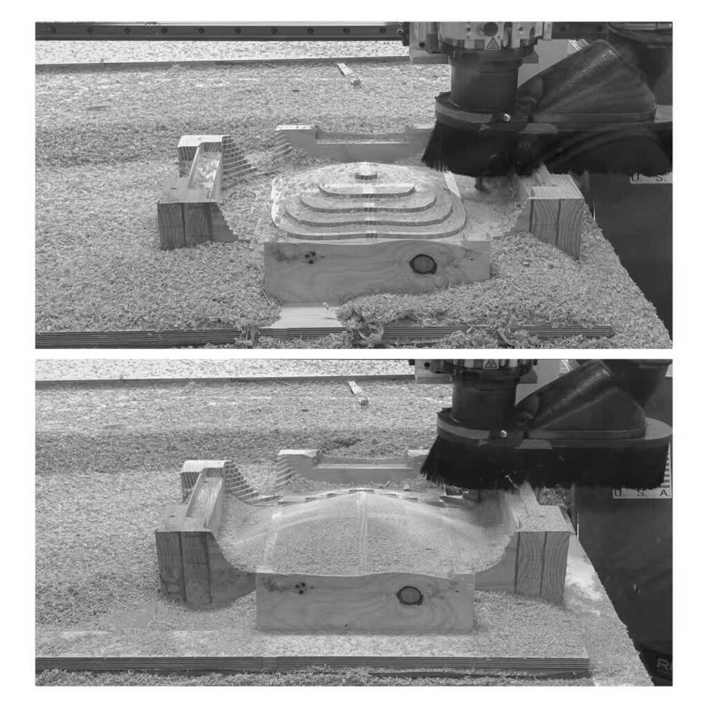 The fabrication of the chair involved carving dimensional lumber into the designed form. The gluing process was carefully planned to balance structural strength and ease of operation. The curved surfaces were shaped by the CNC router and the angle grinder. During assembly, the legs were adjusted to accommodate deviations, ensuring a precise fit with the seat.